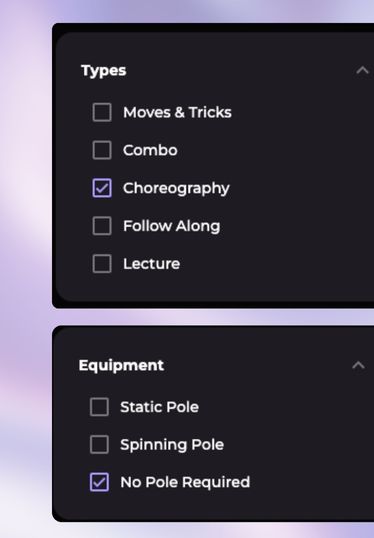 Of course, there are various dance tutorials: floorwork, strip, chair, frame up, theory & stretching routines in our courses where you don’t need a pole. There is also a handy filter that helps you find tutorials where a pole is not needed!